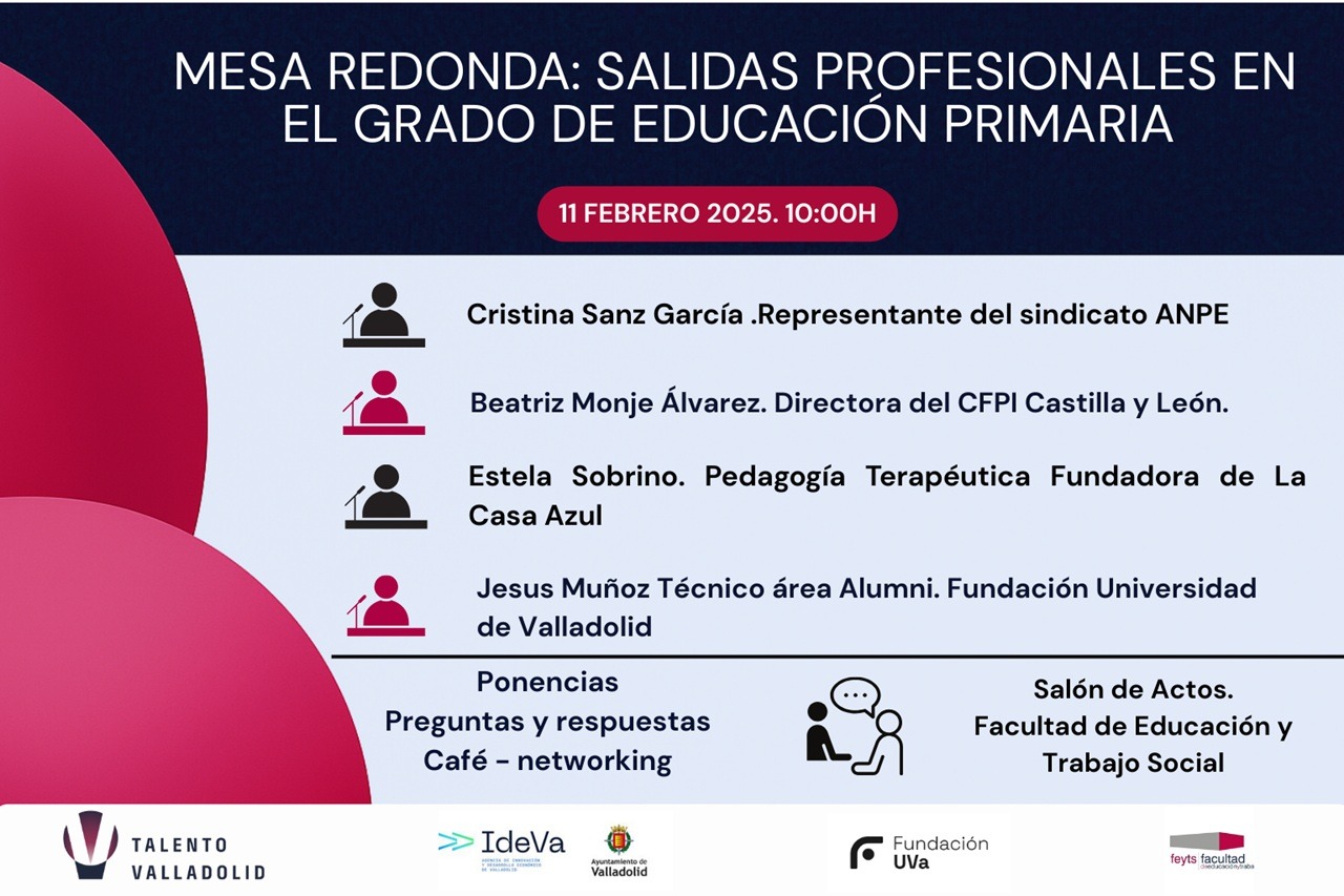 El miércoles 11 de febrero de 10.00 a 11.30 horas, el Salón de Actos de la Facultad de Educación y Trabajo Social de la UVa acoge la mesa redonda 'Salidas profesionales en Educación Primaria', una actividad del programa Talento Valladolid dirigida al alumnado del grado.